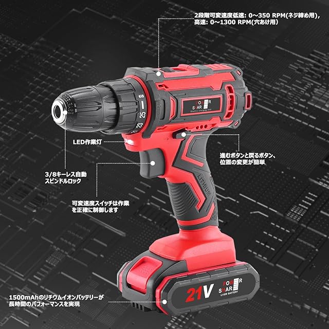 商品名:【電動ドライバー・DIYの強い味方】VANBAR ドリルドライバー 電動ドライバー 小型 コードレス 21V 最大42N.m 電動ドリル 1500mAh バッテリー2個付き ブラシレスモーター 25段階トルク調節 無断変速 充電式ドリルドライバー LEDライト 二段階スピード調節 正逆転切替 電動工具セット 21ドリル/收纳ケース/日本語取説 ネジ締め 穴あけ DIY家具組み立て 操作も簡単で