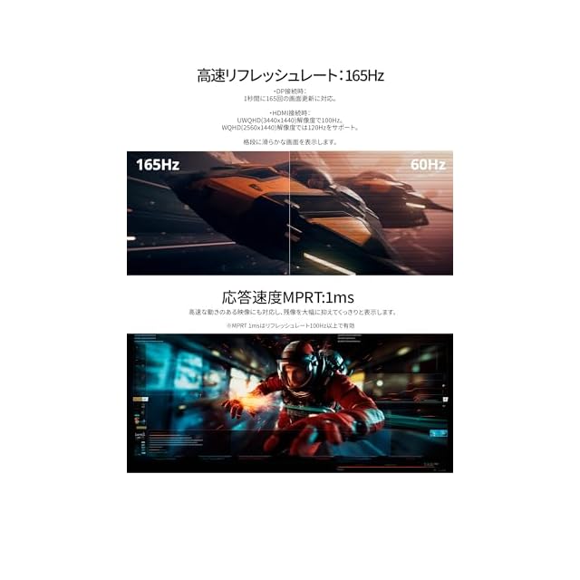 165Hzの高速リフレッシュレートと1ms(MPRT)の応答速度により、高精細で滑らかな映像表現を実現し、FPSなどの動きの速いゲームでも快適なプレイが可能です。*MPRT 1msはリフレッシュレート100Hz以上で有効。