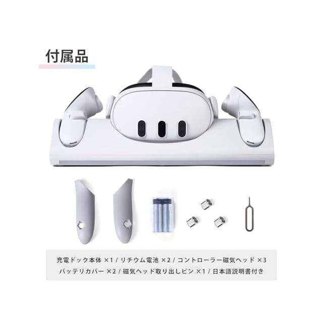 【付属品】VR充電スタンドには、充電ドック本体のほか、リチウム電池2本、コントローラー磁気ヘッド3つ、バッテリーカバー2つ、磁気ヘッド取り出しピン、日本語説明書(兼 書)がついています。