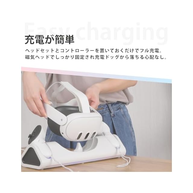 【置くだけ充電】ヘッドセット、コントローラーを置いたまま充電ができ、Meta Quest3用のType C端子の充電ケーブルを使えます。
