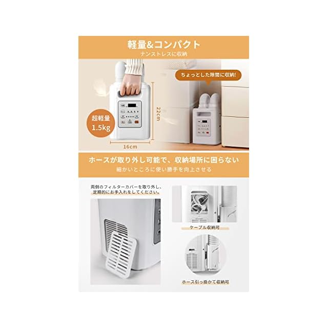 【軽量・小型多機能布団乾燥機】布団乾燥、衣類乾燥、靴乾燥、あたため、収納場所の除湿脱臭などこの1台で全ての役割を果たす温風乾燥機です。1.5KGの持ち運びやすい軽量タイプ、収納場所を取らないコンパクトサイズで、一人暮らしの方にも手軽に使え、複数の部屋で使いまわす場合も便利。花粉が気になって外に洗濯物を干しづらい春先から、湿度が高くなり、ダニ対策が欠かせない夏場、さらに寒さが厳しい冬場に至るまで、年間を通して大活躍。