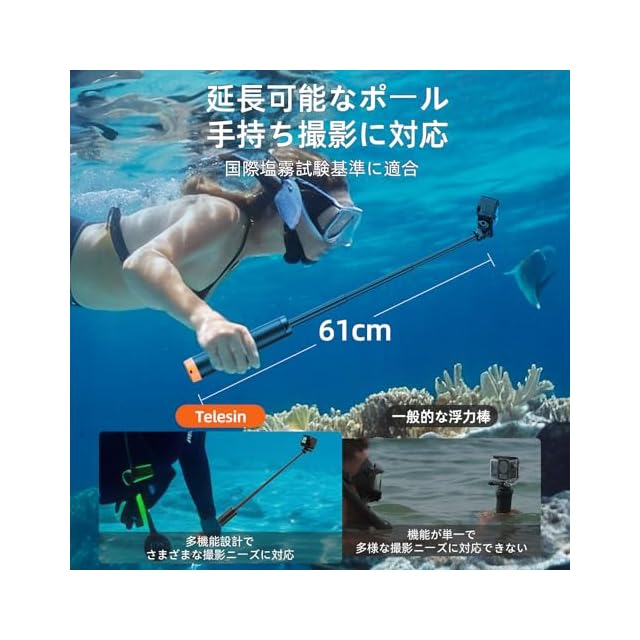 商品名:【TELESIN公式】 4-in-1多機能防水浮力ミニ三脚 GoProアクセサリー フローティンググリップ ダイビング撮影用 深水防護 三段伸縮調整可能 陸海両用自撮り棒 1/4インチネジ穴 多機能対応 軽量 滑り防止 手绳付き 紛失防止 浮上設計 塩雾試験合格品 Hero 13-5 BLACK MAX MINI/insta/AKASO/DJI Osmo 3 4 5 PRO/アクションカメラ用