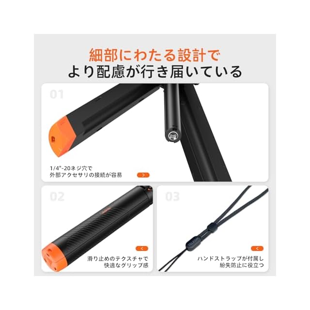【多機能4-in-1設計】この製品は、フロートハンドル、ミニ三脚、防水伸縮自撮り棒、自撮り棒ハンドルの四つの機能を一体化し、撮影の全面的なサポートを提供します。防水設計により水中で優れたパフォーマンスを発揮し、素材はISO基準の塩水噴霧試験をクリアしており、品質もされています。目を引くオレンジ色のデザインは、ファッション性を備えるだけでなく、あらゆる環境で簡単に見つけられるため、安全性も向上します。