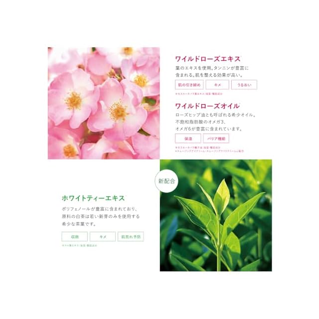 ワイルドローズとホワイトティエキス*³がキメの美しいなめらかな肌に整えます。 * モスカータバラ葉エキス・チャ葉エキス:保湿・整肌成分