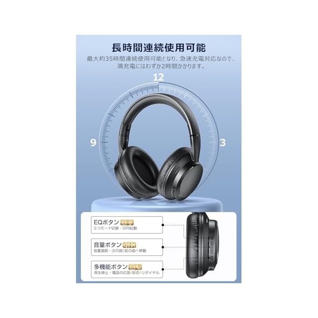 【最大35時間の連続再生が可能&無線・有線両方対応】ワイヤレスヘッドホンは500mAh大容量のバッテリー付き、省電力設計により1回のフルー充電で最大35時間の連続使用が可能です。音楽なら約300曲以上聴することが可能です。ワイヤレスの無線接続により、市販されている99%以上のBluetoothデバイスに適用されます。また、付属の3.5mmオーディオケーブルの有線接続でPC、パソコン、タブレット、スマホなどのデバイスと接続して使用できます。バッテリーが切れた場合や、Bluetooth機能を持たないデバイスとも接続が可能です。