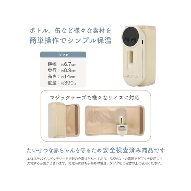 【付属品】USBケーブル / 説明書(疑問解決方法記載) / LARUTANボトルウォーマー本体 ※USB電源アダプタは付属しません(別売)。5V,2Aのアダプタが必要です。それ以外(スマートフォンなどで使用されている5V1Aのアダプタなど)のアダプタをご使用による 故障につきましては責任を負いかねます。必ず取扱説明書をお読みになってからご使用ください。また本製品は充電式のため、使用前に充電が必要です。