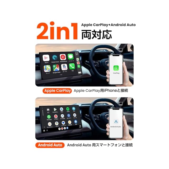 「Apple CarPlay・Android Auto両対応」①有線CarPlayがワイヤレスCarPlayに、②有線Android AutoがワイヤレスAndroid Autoに変換可能です。さらに、2台のスマホを交互に使用することもでき、使わないスマホのBluetoothを切れば、使用したいスマホを接続することができます。