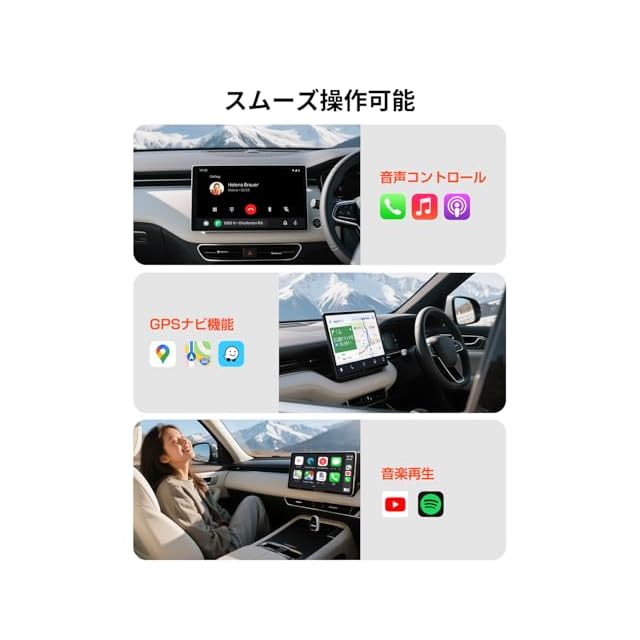 「有線接続を無線化しよう!」有線接続では、接続が不安定になり時々切断されることがありますが、本製品を使うことにより、有線のApple CarPlayやAndroid Autoを無線で使用できるようになります。スマホをポケットやカバンに入れたまま接続できるため、接続が非常に便利になります。これにより、運転中の快適さが大幅にアップグレードします。
