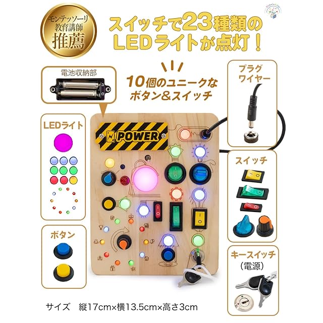 商品名:【知育のプロ推薦】モンテッソーリ ピカピカ★ビジーボード 知育玩具 おもちゃ【23種類のLEDライト】【食品衛生法試験合格】【二重検品安全設計】1歳 2歳 3歳 誕生日 プレゼント 木製感覚 指先知育 早期開発 幼児 男の子 女の子 ドライバー付き【日本正規品】