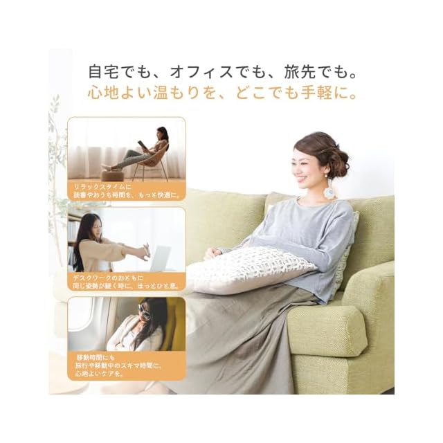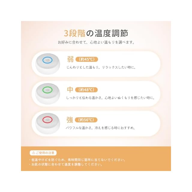 3段階の温度調節で、心地よさを自分好みに:約43℃・50℃・56℃の3段階温度設定。お好みやシーンに合わせて、じんわりとした温もりを自由にコントロールできます。
