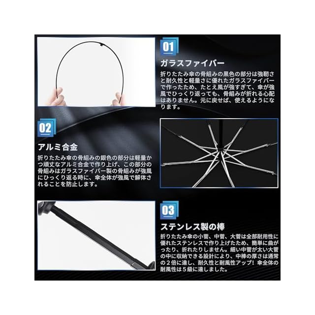 【高強靭傘骨で安定した使用】この折りたたみ傘は、頑丈な8本の傘骨で作られており、耐久性と強靭性を持つカーボンファイバー傘骨を採用しています。強風や豪雨などの悪天候でも折れたり曲がったりしにくく、安定した使用が可能です。さらに、さび付きの心配もありません。これにより、長期間にわたって安心してご利用いただけます。