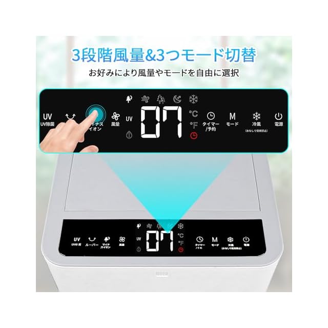 【3つモード・3段階風量切替】本冷風機 はノーマルモード、リズムモード、スリープモード3つモードを切り替わりながら、モードごとも弱、中、強3段階風量を調節できます。ノーマルモードは風量ボタンで選択した強さで作動します;リズムモードはプログラムの内容は、風量ボタンによって[弱] [中] [強]の3種類が選べます。正常風モードは継続的に送風します。自然風モードは自動的に風量が変化するため、自然の風に近い風を送ります。睡眠風モードは設定した風量から、30分の時間を経過したら自然風モードになります。寝るごろには風量が弱まりますので睡眠中は風量を弱めたい方におすすめします。