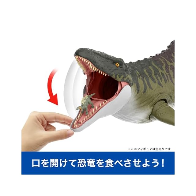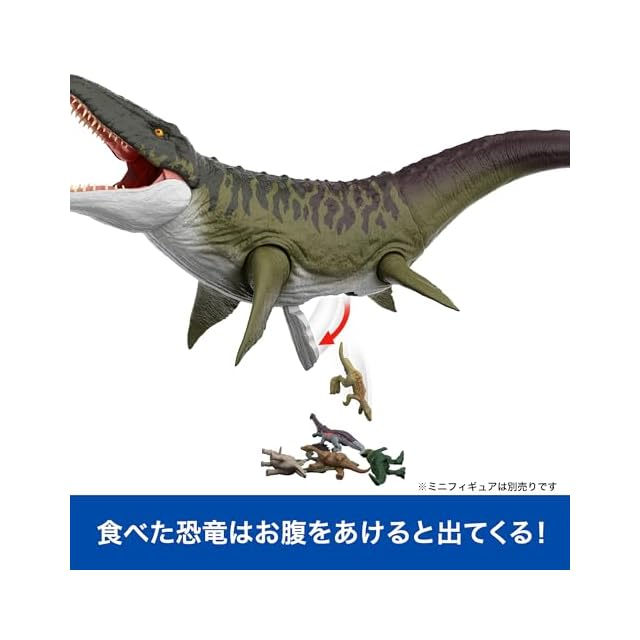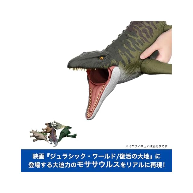 【内容】映画『ジュラシック・ワールド/復活の大地』に登場する全長約93cmの大迫力のスーパービッグサイズのモササウルス!口を開けて別売りのミニフィギュアを食べさせよう!おなかを開けると出てくるよ! Universal City Studios LLC and Amblin Entertainment, Inc. All Rights Reserved.