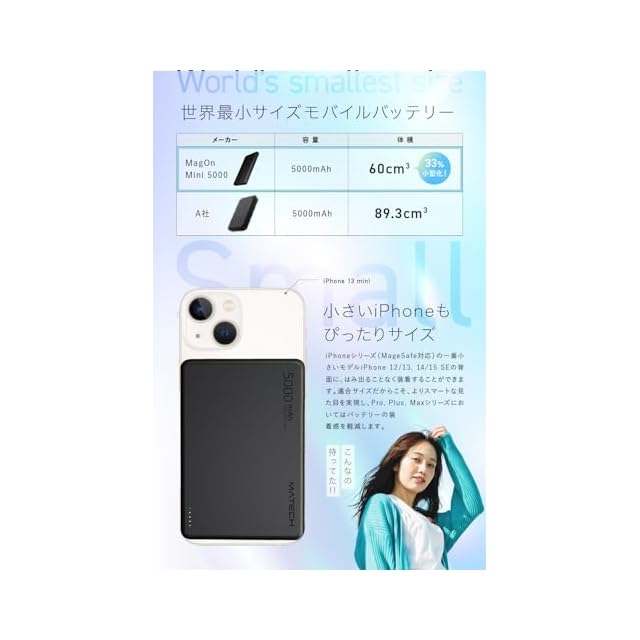 【世界最小サイズモバイルバッテリー】世界最小サイズモバイルバッテリーを実現しました。(※5000mAh以上の容量を有するMagSafe対応製品において世界最小サイズを記録(60cm3) 自社調査より(2024年5月1日時点)従来のサイズより、33%小型化!(MagOn Mini 5000mAh 60cm3、A社5000mAh 89.3cm3)