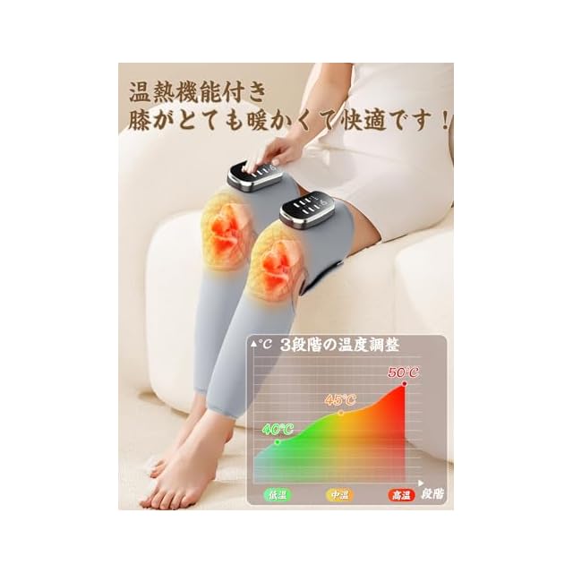 【ひざ保温/タイマー機能】ひざ・ふくらはぎ・太ももの3か所にエアバッグを搭載し、脚全体をしっかり包み込んで加圧。3種類のモードと強度からお選びいただけます。締め付けが苦手な方でも、マジックテープで簡単に調整可能です。温度は3段階(低温40℃・中温45℃・高温50℃)から選択可能。足元の冷えが気になる方に最適で、寒い季節でも快適にご使用いただけます。暑い夏場はヒーター機能をオフにすることもできます。15分・20分・25分・30分の自動タイマー設定が可能なため、使いすぎの心配がありません。静かな作動音で、就寝時にも安心して脚のケアができます。※ご注意:肌に直接装着しないでください。体質によっては熱がこもりすぎてやけどする恐れがあります。