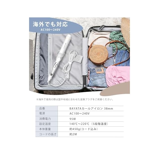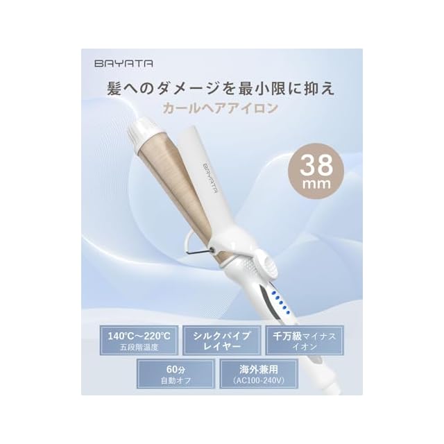 商品名:BAYATA コテ 38MM ヘアアイロン カールアイロン 【瞬間水分蒸発しない・140℃〜220℃・マイナスイオン・海外対応】韓国風ヘア シルクプロコテ 5段階温度調節 全髪質対応 急速立ち上がり 100V-240V海外対応