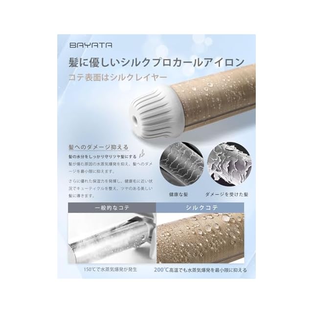 【140℃~220℃6段階の温度調節可能・全髪質対応】BAYATAシルクプロコテはMAX220℃のプロ仕様で、140℃~220℃まで、20℃ごとに6段階で温度調整が可能です。髪質やヘアスタイルに応じて最適な温度を調節できます。また、耐熱性が強いスタンドを搭載しており、熱が冷めるのを待つことなく置けるのが便利です。