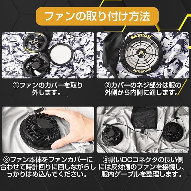 作業服用 ファン DC接続ケーブル付き 5V ~ 42V対応 静音 熱中症対策 作業服適用直径9cm 日本語説明書付き