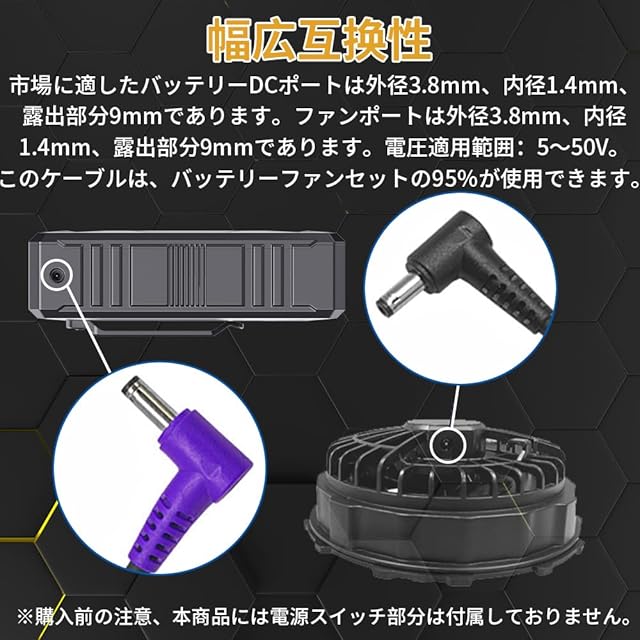 商品名:作業服用 ファン DC接続ケーブル付き 5V ~ 42V対応 静音 熱中症対策 作業服適用直径9cm 日本語説明書付き