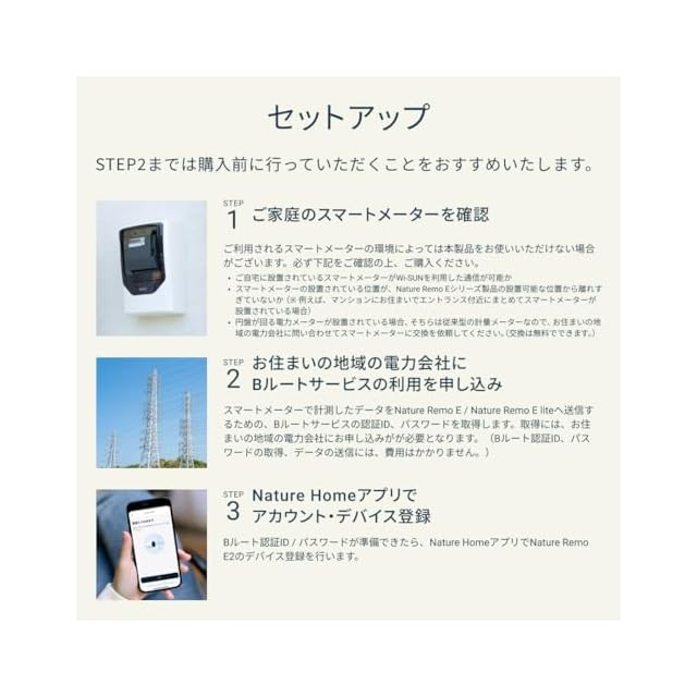 【転売行為の禁止について】<br>当社商品の転売、オークションサイト等での出品・販売を目的とした当社商品の購入申込みは、直接の申込み又は第三者を通じた申込みを問わず、固くお断りさせていただいております。<br><br>【購入前にご確認いただきたいこと】<br>・iOS 13.6以降またはAndroid 6.0以降のスマートフォンもしくはタブレットと、常時インターネット接続が行えるWi-Fi環境が必要です。<br>・スマートメーターをNature Remo Eシリーズの製品に接続するためには、電力会社が発行するBルートサービスのID、パスワードを取得する必要があります。発行には1~2週間程度かかるため、事前に発行してください。<br>・利用されるスマートメーターの環境によっては本製品をお使いいただけない場合がございます。ご自宅に設置されているスマートメーターがWi-SUNを利用した通信が可能か、スマートメーターの設置されている位置が、Nature Remo Eシリーズ製品の設置可能な位置から離れすぎていないかについては、事前にご確認ください。