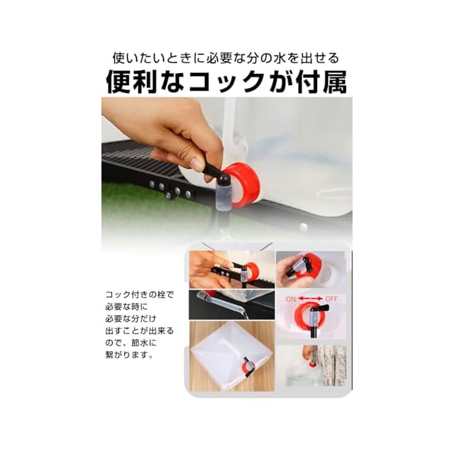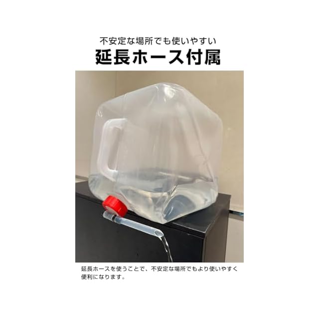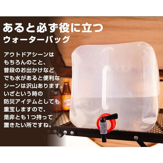 アウトドアシーンはもちろんのこと、 普段のお出かけなどでも水があると便利な シーンは沢山あります。いざという時の 防災アイテムとしても重宝しますので、 是非とも1つ持って置きたい所ですね。 ※飲料水用の水タンクとしては使用しないで下さい。