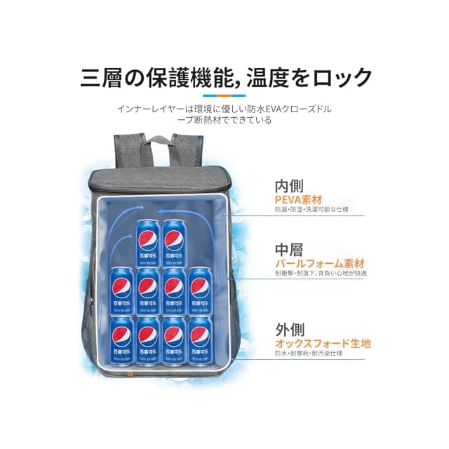 【4層高品質素材】外層はオックスフォード生地、内層EPEフォーム厚くし、不織布、高品質のPEVAを内蔵し、外部からの熱を効果的に遮断し、内部の温度を長時間低く保ちます。アイスパック4~6個と一緒に使えば、10~20時間保冷できます。 防水性があり、溶けても漏れません。丈夫で耐久性があります。