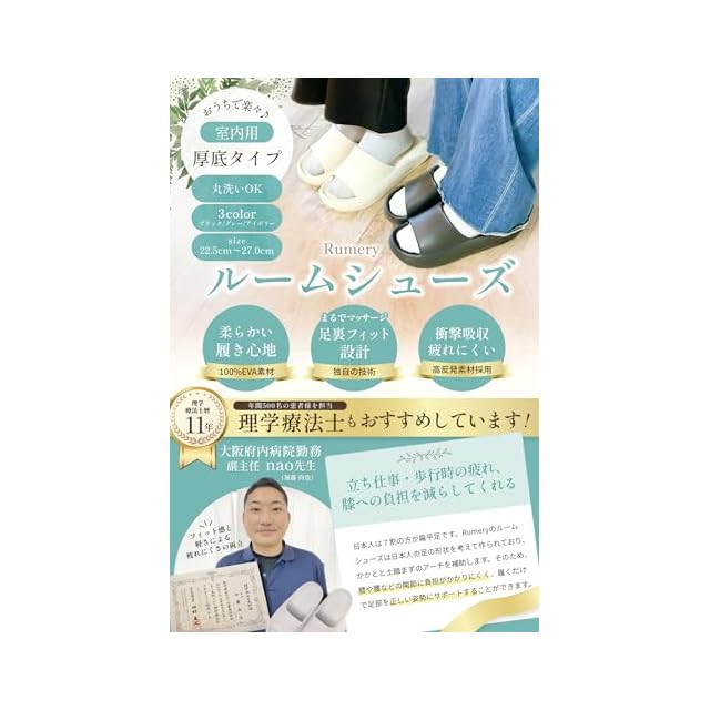 【注意事項】熱に弱い素材のためし室内や日が当たらないところでの着用をおすすめします。直射日光に当たると変形する可能性があります。親指が出っ張っている方はジャストサイズだとキツいと感じる場合があります。着用方法やサイズ感が気になる方は購入前にお気軽に問い合わせください。 【日本人向けにサイズ展開】日本人の一般的なサイズ感を徹底的に調査して開発しました。22.5~23.0、23.5~24.0、24.5~25.5、26.0~27.0の4サイズを揃えているので、普段履かれる靴と同じサイズ、足幅が狭い方は1サイズ小さいめの購入をおすすめします。※購入後万が一サイズが合わない場合はサイズ交換が可能ですのでご安心ください。 【弾力性に優れた素材】スリッパの素材は音や衝撃を吸収するジョイントマットにも使われる弾力性に優れた100%EVAを使用しています。着用し続けてもへたりにくいため長期間マイルームシューズとして愛用することができます。 【履き心地の良さ】土踏まずの形に合わせてかかと部分に膨らみがあるので足にフィットします。スリッパを室内で脱いだり履いたりしやすい形状です。 【疲れや痛みを感じにくい】高反発素材で衝撃を吸収するので痛みや疲れを感じにくいです。ソールの高さは一番高い部分が3.5cmあるのでキッチンで料理をする時、掃除をする時など長時間立っていても疲れにくいのが特徴です。 【箱タイプから持ち運び便利な巾着袋にリニューアル】2024年10月下旬分より、持ち運びに便利なオリジナル巾着袋にスリッパが入った状態でお届けいたします。授業参観やオフィスでの持ち運びにも便利です。