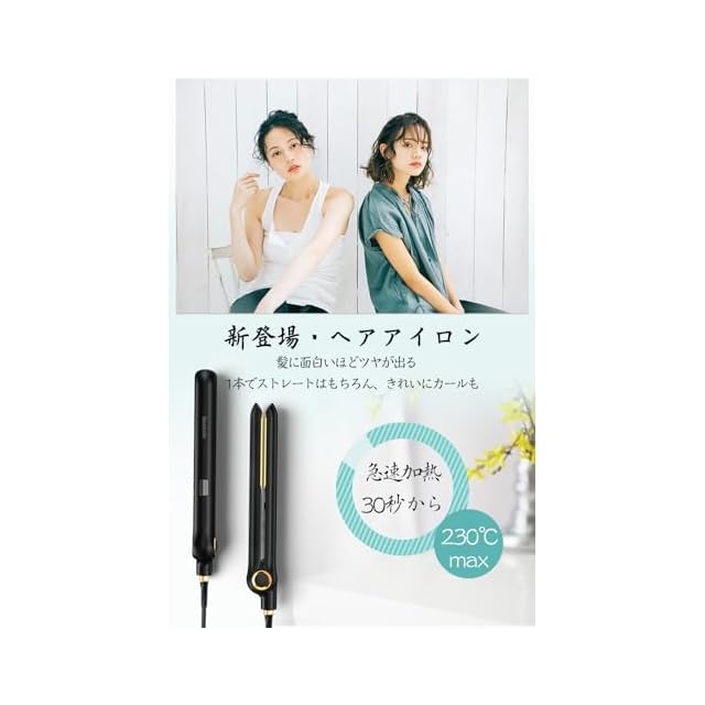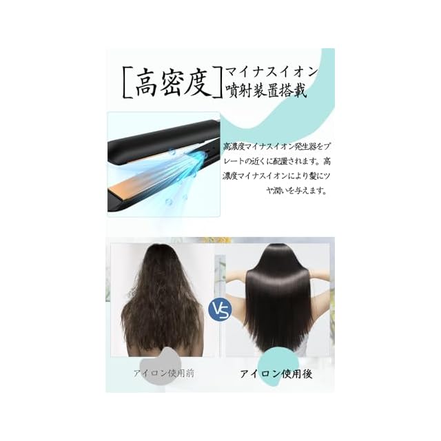 ③【マイナスイオン搭載で髪に優しいヘアアイロン】 静電気を抑え、潤いを与えるマイナスイオンを放出するヘアアイロン。髪のパサつきを抑え、ツヤのある美しい仕上がりに導きます。毎日使っても髪にやさしいため、ダメージが気になる方にもおすすめ。ヘアケアとスタイリングを両立したい方に最適です。