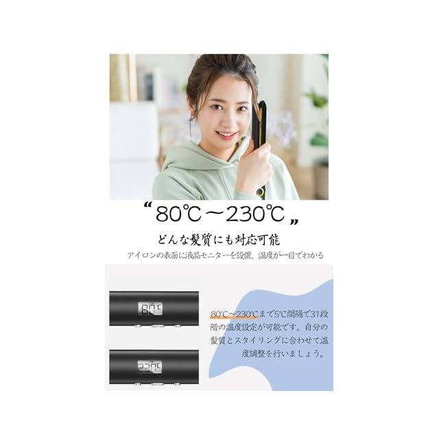 ②【80℃〜230℃の幅広い温度調整で全髪質に対応したヘアアイロン】 髪質やスタイルに合わせて80℃~230℃まで細かく温度設定が可能なヘアアイロン。LCD液晶モニターで温度を一目で確認でき、髪を傷めずに効率よくスタイリングできます。細い髪にも、太くて広がりやすい髪にも、プロ級の仕上がりを実現。