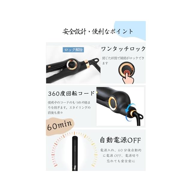 ④【軽量&コンパクト設計、ワンタッチロック付きで持ち運びもラクラク】 わずか数百グラムの軽量設計で、手が疲れにくく長時間の使用にも最適なヘアアイロン。コンパクトで収納・携帯性も抜群。ワンタッチロック機能付きなので、旅行や出張時にも安全・安心。自宅でも外出先でもスタイルをキープできます。