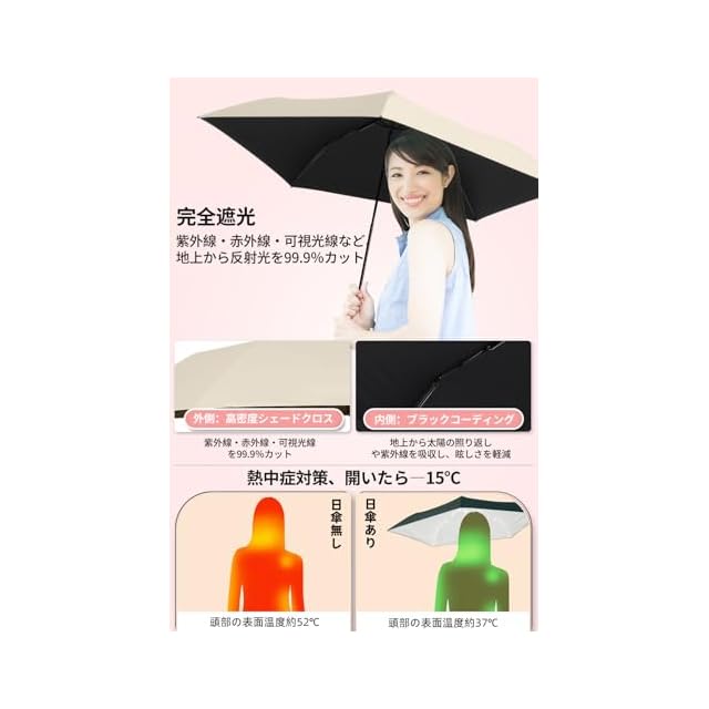 【一級遮光&紫外線カット】 UVカット100%・遮光100%の折り畳み日傘です。折りたたみ日傘の傘面にはナノ高分子断熱素材を使用し、光をしっかり反射。さらに、日傘裏面のブラックコーティングが照り返しの紫外線を防ぎます。黒色は光を吸収しやすいため、顔への照り返しを抑え、眩しさを軽減します。