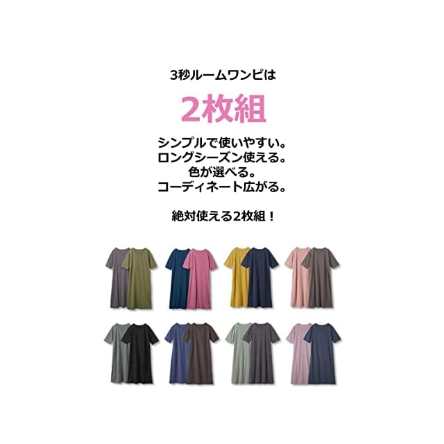 3秒あればもう無敵!<br>サッと着てスタイル決まる、ルームワンピース。<br>綿混の天竺で涼しげなワンピース。ゆったりとしたシルエットで真夏まで着用できます。トレンド感もあるデザインとカラーでワンマイルウェアとしても活躍しそう。1枚でも、ボトムやロングスカートとのコーディネートも楽しめます。2枚組でとってもお得です。<br><br>【S】:着丈:116cm、バスト:94cm、肩幅:45cm、袖丈:27cm<br>【M】:着丈:118cm、バスト:100cm、肩幅:48cm、袖丈:28cm<br>【L】:着丈:120cm、バスト:106cm、肩幅:51cm、袖丈:28cm<br>【LL】:着丈:120cm、バスト:112cm、肩幅:53cm、袖丈:28cm<br>【3L】:着丈:120cm、バスト:118cm、肩幅:55cm、袖丈:28cm<br>【4L】:着丈:120cm、バスト:124cm、肩幅:57cm、袖丈:28cm<br>【5L】:着丈:120cm、バスト:130cm、肩幅:59cm、袖丈:28cm<br>【6L】:着丈:120cm、バスト:138cm、肩幅:62cm、袖丈:28cm<br>【8L】:着丈:120cm、バスト:148cm、肩幅:64cm、袖丈:28cm<br>【10L】:着丈:120cm、バスト:158cm、肩幅:66cm、袖丈:28cm