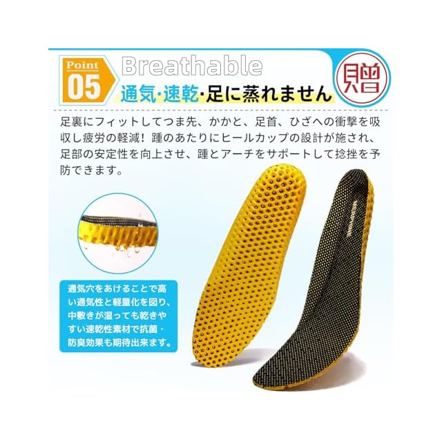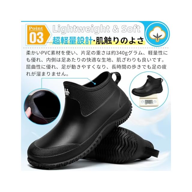 【履き心地の改良】軽量設計足元の負担を軽減。雨の日でも軽快に歩けるよう、軽量化を実現。工場は元々配置したオリジナルの中敷きを加えて、通気性に優れた高弾性の中敷きを一足プレゼントしました、靴内部のムレを軽減します足に掛かる負担を分散。屈曲性に優れ、足が動きやすくなり、長時間の歩きでも足の疲れが溜まりません。