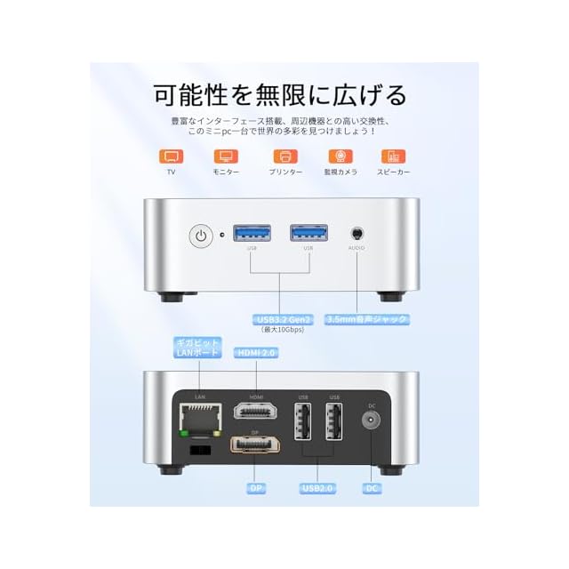 【多彩なインターフェース+臨場感あふれる4K出力】: 【ミニPCの実用性を高めるポート群】Intel N150搭載したミニPCは2つのUSB 3.2(Type-A)ポートを搭載しており、最大10Gbpsの高速データ転送が可能です。外付けHDDやその他の周辺機器とスムーズに接続でき、大容量データの転送やファイル操作がストレスフリーで行えます。画像出力ポート以外には USB2.0*2(Type-A)、1000Mbps有線LANポート*1、3.5mmの音声ジャック*1なども備え、多彩な周辺機器と接続が可能で多様なニーズに対応します。【4K@60Hz 2画面出力】この小型pcに搭載されたHDMI2.0とDP1.4端子各一つを通してサイズ自由の大画面モニターとの接続も可能で、作業中も多くの情報を見やすく表示できます。統合されたインテルUHD Graphicsより最大4096x2160@60Hzの高精細画質出力対応し、クリアで鮮明な映像やテキストを提供し、デザインや編集作業にも最適です。