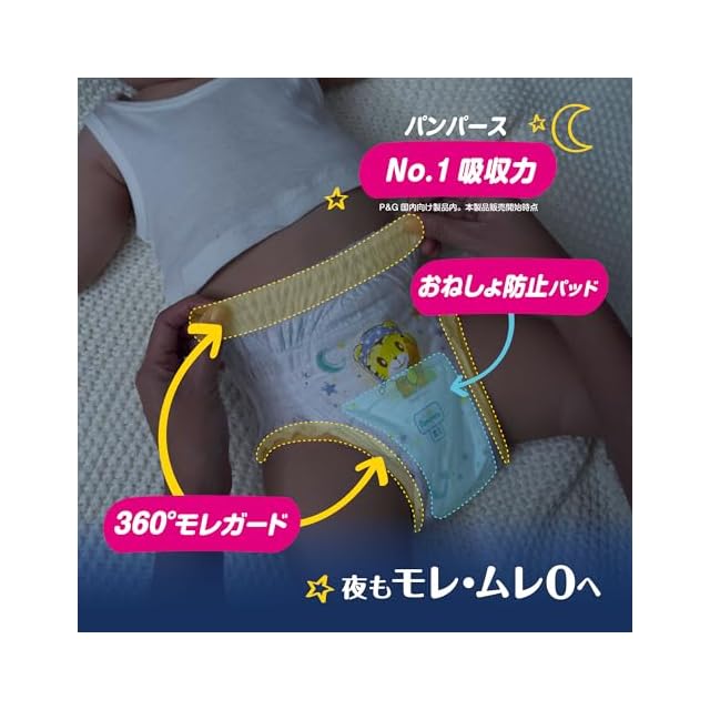 【パンパース おやすみパンツ おねしょ防止パッド新採用!】夜は昼の10倍モレやすい*。おねしょ防止パッドを搭載し、一晩中のおしっこを受け止めます。夜もモレ・ムレ安心。 * P&G調べ(Lサイズ, N=115)