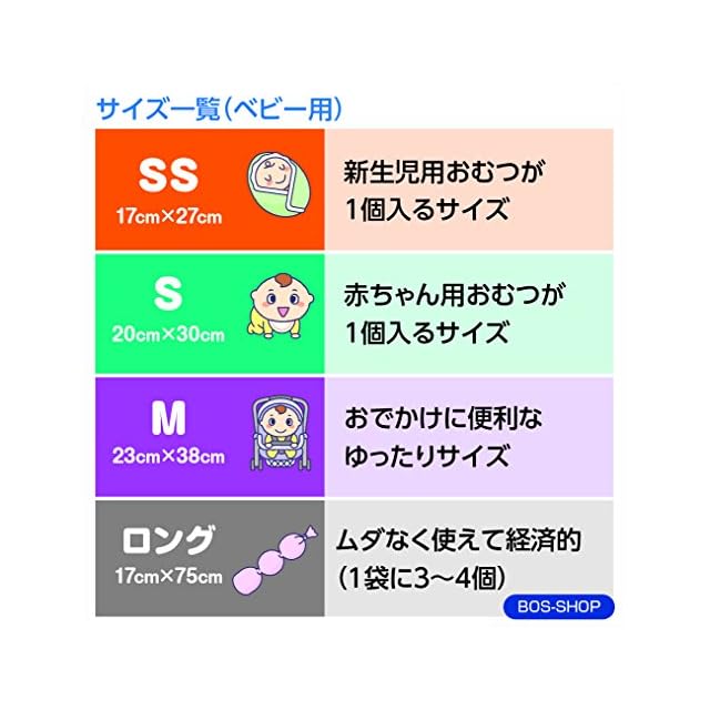 私たち「BOS-SHOP」は高機能な袋を製造しているメーカーです。 <br>BOS(ボス)はうんちの臭いを防ぐために開発されました。 <br>長い開発期間を経て生まれたBOS。防臭力は圧倒的!自信を持っておすすめ致します。 <br>BOSをご購入いただいた方のアンケート結果やカスタマーレビューでは、多くの驚きの声と共に、とても高いご評価を頂きました。 <br> <br><アンケート結果> <br>「今後もBOSを購入したい」…95% <br>「BOSの防臭性能に満足」…99% <br>「BOSで臭い問題が解決」…99% <br>※ご回答者数:150名(ご協力いただいた皆さまありがとうございました!) <br> <br><袋サイズ別ご使用目安> <br>SSサイズ(17×27cm)…うんち処理(小型犬) <br>Sサイズ(20×30cm)…うんち処理(中型犬)、ペットシーツ(レギュラーサイズ) <br>Mサイズ(23×38cm) …うんち処理(大型犬)、ペットシーツ(ワイドサイズ) <br>Lサイズ(30×40cm・マチ付)…ペットシーツ(スーパーワイドサイズ) <br>※他にもLLサイズ(35×50cm・マチ付)、ロングサイズ(17×75cm)もございますので、用途に合わせてお選びください。 <br> <br>※BOSの防臭性能は大変優れていますが、完全に防ぐものではありません。バケツなどに密閉しますと、わずかに漏れる臭いがバケツ内に溜まり、臭いを感じることがあります。