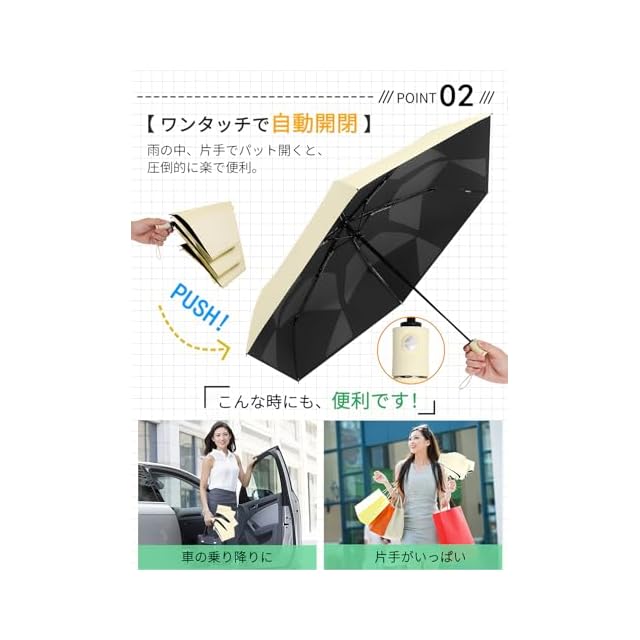 【自動開閉・片手で楽】たった3秒で折りたたみ可能で、ボタン一つで自動開閉もできます。傘を開くときは留め具のボタンを外したら傘を上へ向けてボタンを押すだけ、スムーズに素早く柄が伸びて傘がしっかり開きます。片手で傘先の金具に固定する必要がないので、荷物が多い時、降雨時に車から降りる時にもパッと開く、濡れる心配がなく、圧倒的に楽で便利です。