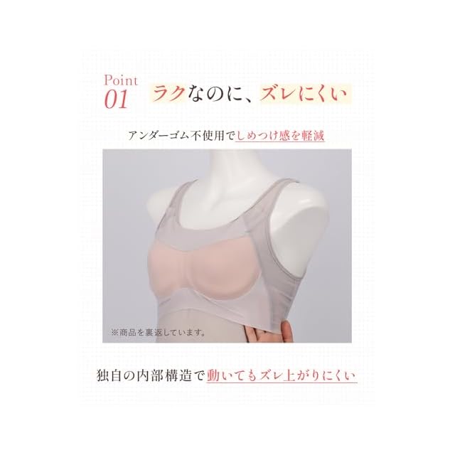 【ラクなのにズレにくい】バスト部分はアンダーゴムがなく、しめつけ感を軽減。しかもズレ上がりにくい