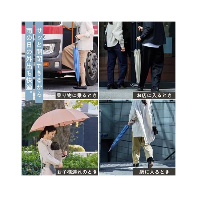 【ベルトがなく、手を濡らさずまとまる傘】傘をとじたあと、手でまとめて、ベルトで留める。手が濡れてしまうのは、当たりまえ。そんな煩わしさを無くし「たたまなくていい。」「手が濡れない。」を実現。とじるだけで、生地がまとまる新しい傘が生まれました。【ご注意】傘をしまう際は、広げて湿気を十分に取り除いてください。濡れた傘をそのまま保管したり乾燥が不十分なまま収納すると、傘骨が錆びたり生地が変色したり色移りすることがあります。