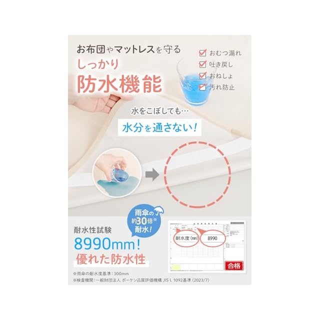 【しっかり防水】裏面のポリウレタンコーティングが水分をしっかりガード!布団を濡らさずに毎朝ストレスフリー。通常のパットでは染み込んでしまっていた水分も防水シーツなら通しません。防水シートを使用すればマットやお布団のストレスから解放されます。