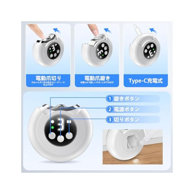 商品名:【2025 アップグレード版 人気】 電動爪切り 電動爪削り 自動爪切り 爪切り 電動 爪とぎ 爪削り爪磨き 3段階スピード LEDライト Type-C充電式 爪傷防止 安全 低騒音 軽量 操作簡単 飛び散り防止設計・ゴミボックス内蔵 持ち運びに便利 子供/大人/高齢者に向け ブラシ付き