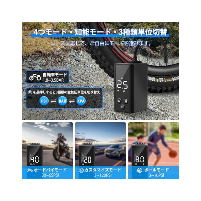 【 自動停止・空気圧表示・4つモード・3種単位切替 】 この自転車空気入れは設定した空気圧値に達すると自動的に停止し、空気の入れすぎを防ぐ1分間の自動停止機能が付いています。さらに、製品の空気圧を測定できます。電動空気入れは自転車・オードバイ・ボール・カスタマイズの4種類モードを選択でき、ワンタッチで簡単に使用できるので、初心者の方でも心配なし!電動ポンプの空気圧単位は「PSI」「BAR」「KPA」3つが選択でき、必要に応じて簡単に切り替えられます。