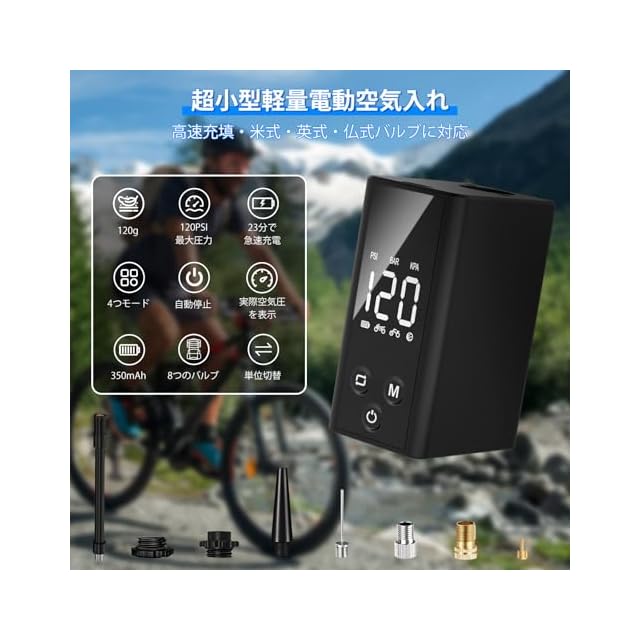 商品名:自転車空気入れ【120PSI・自動停止・空気圧表示・米式&英式&仏式バルブ対応 】電動ポンプ 120g 小型・最軽量 4つモード 単位切替 ロードバイク クロスバイク マウンテンバイク 携帯 タイヤ電動空気入れ コンパクト ミニ 自転車 オートバイ 浮き輪 ボール用 350mAh USB充電式エアーポンプ 23分で急速充電 8つのバルブ エアーホース・収納袋・シリコン保護カバー・日本説明書付き