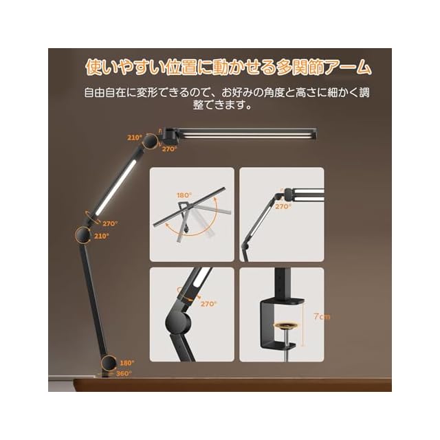 【クランプ式デスクランプ&タイマー機能】自在アーム(最大78cm)でどんな姿勢もサポート!クランプの最大挟む厚さは7cmまで。作業スペースにぴったり光を調整可能。30分/60分/120分タイマー機能搭載で、つけっぱなし防止&目覚めの目覚ましライトとしても便利。読書からPC作業まで、あなたのライフスタイルに寄り添うスマート照明。