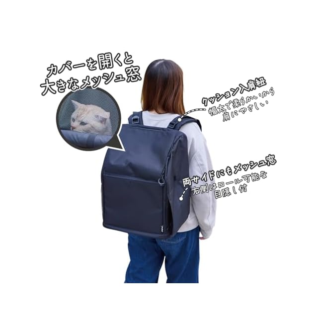 フタが前に開くので、前抱えの時にジャマにならない犬猫用リュックキャリー。ショルダーベルトや底板も背負いやすくする機能満載で、おでかけ快適!