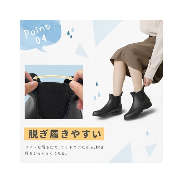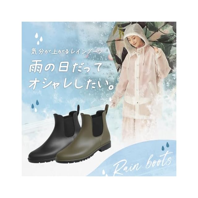 【コーデ万能レインブーツ】サイドゴアのチェルシーショートブーツ設計では、日常履きでも違和感なし、コーデ万能な一足!男女兼用、22.5cmから26.5cmまでサイズ展開。スカートもパンツもどんな服装にも馴染む、特に梅雨や台風の時のデイリーコーデ必須アイテム。