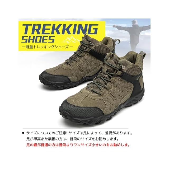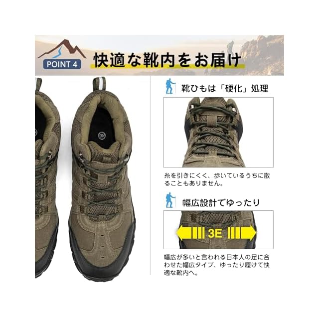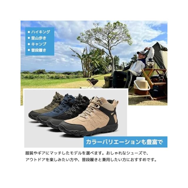 高耐久性で過酷な環境にも対応 登山やハイキング、キャンプなどの厳しい環境にも対応できる高耐久性の登山靴。高品質なラバーソールと強化レザーを使用し、岩場や泥道でも長持ちします。アッパー部分は高い強度を誇り、登山や山登りでも足元をしっかり守ります。過酷な環境でも長時間使用でき、アウトドアやハイキングに最適です。
