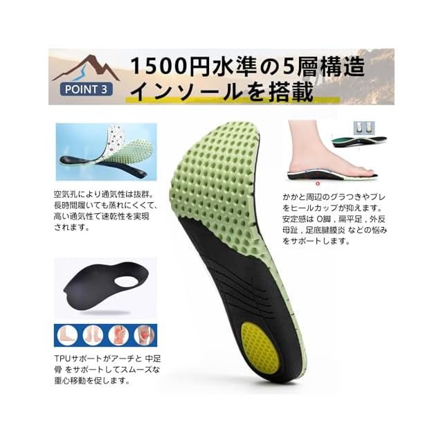 快適な履き心地で長時間使用可能 高いクッション性を持つインソールと、足にフィットする設計で、長時間の歩行でも快適さを維持します。通気性に優れた素材を使用し、湿気を効率的に逃がすことで、特に夏や湿気の多い環境でも快適に使用できます。山歩きやウォーキングなど、アウトドア活動にも最適です。
