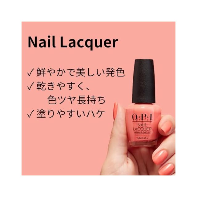 【乾きやすく、色ツヤ長持ち】短時間で乾き、色ツヤは最大1週間*もちます。(*OPIネイルラッカーのベースコート、カラー、トップコートを使用した場合)