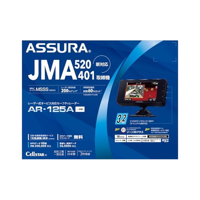 商品名:セルスター レーザー式オービス対応セーフティレーダー AR-125A JMA520/401対応 MSSS対応一体型 18バンド 高精度GPSモジュール搭載 準天頂衛星「みちびき」対応 ゾーン30プラス対応 OBDII対応 3.2インチ GPSデータ更新無料 日本製 3年 CELLSTAR